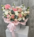 Композицію, яку ви отримаєте може відрізнятися від представленої на фото. Вона буде виконана такої форми і кольору, але квіти відрізнятимуться в залежності від сезону і наявності на вітрині. Перед зборкою композиції ми вишлемо фото на погодження складу.